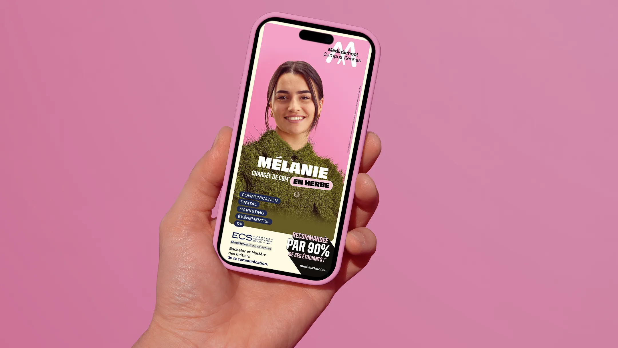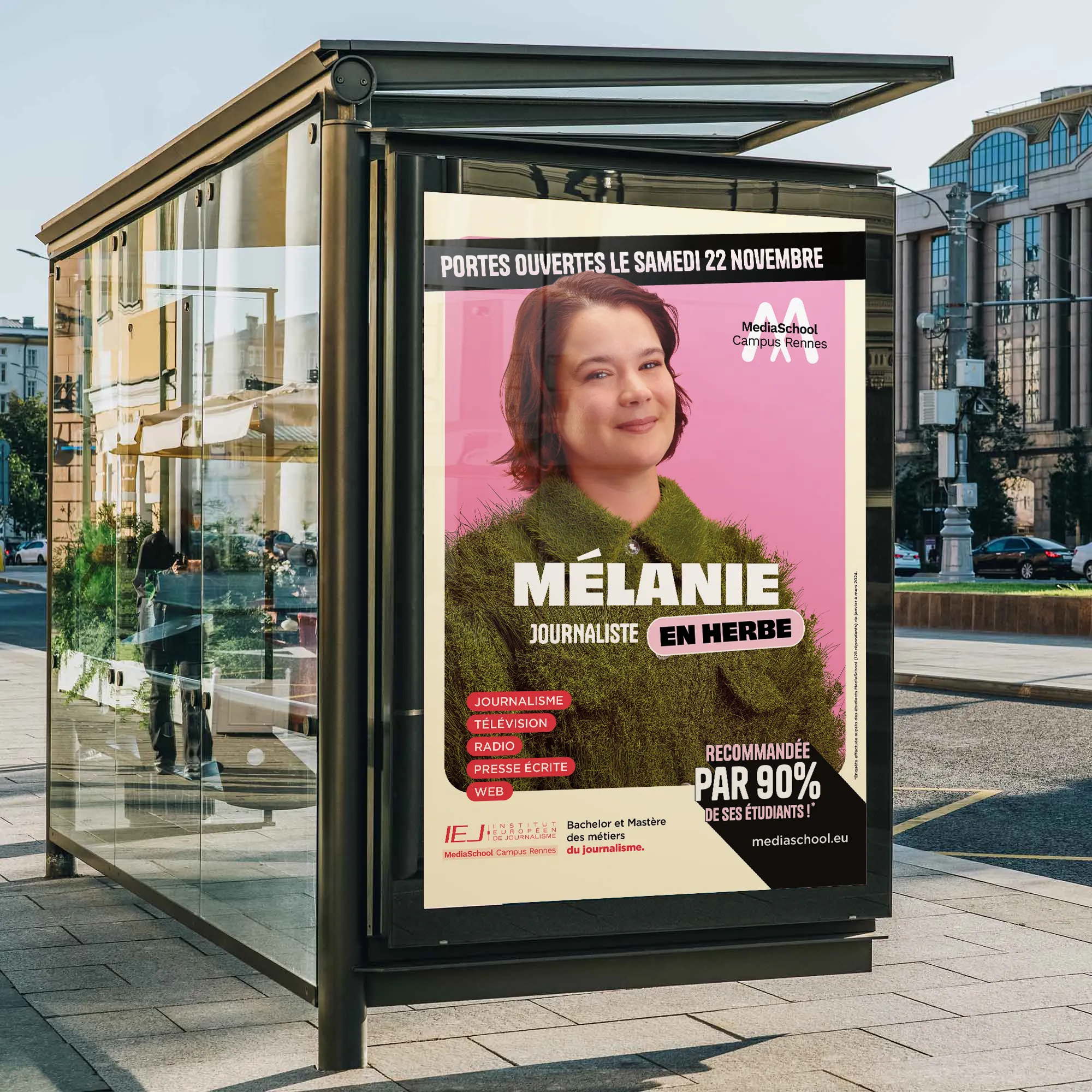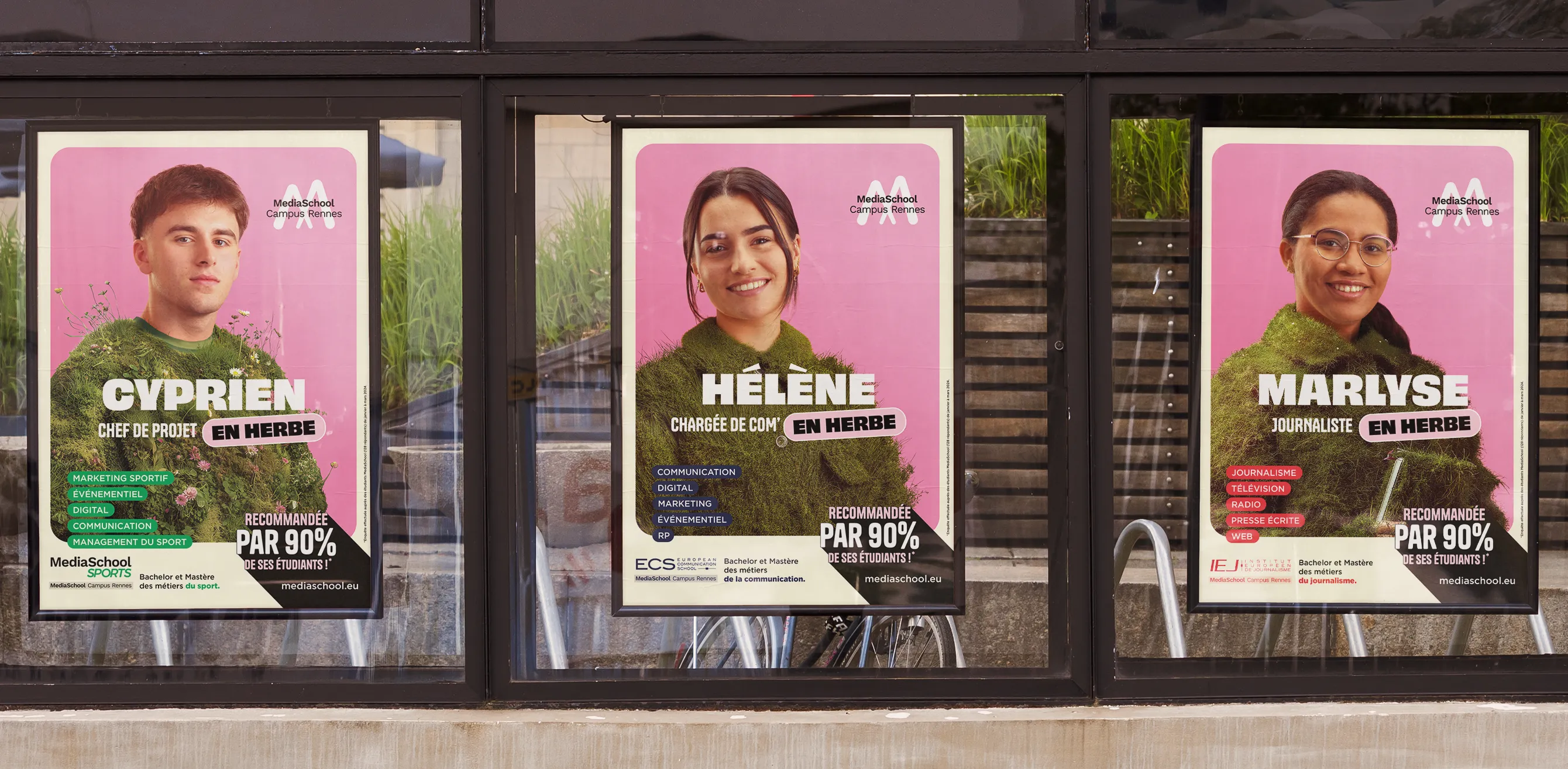 Stratégie de communication et création de la campagne annuelle 2025-2026 pour l'école Mediaschool Rennes. Shooting photo, photomontage et copywriting pas au ras des pâquerettes.